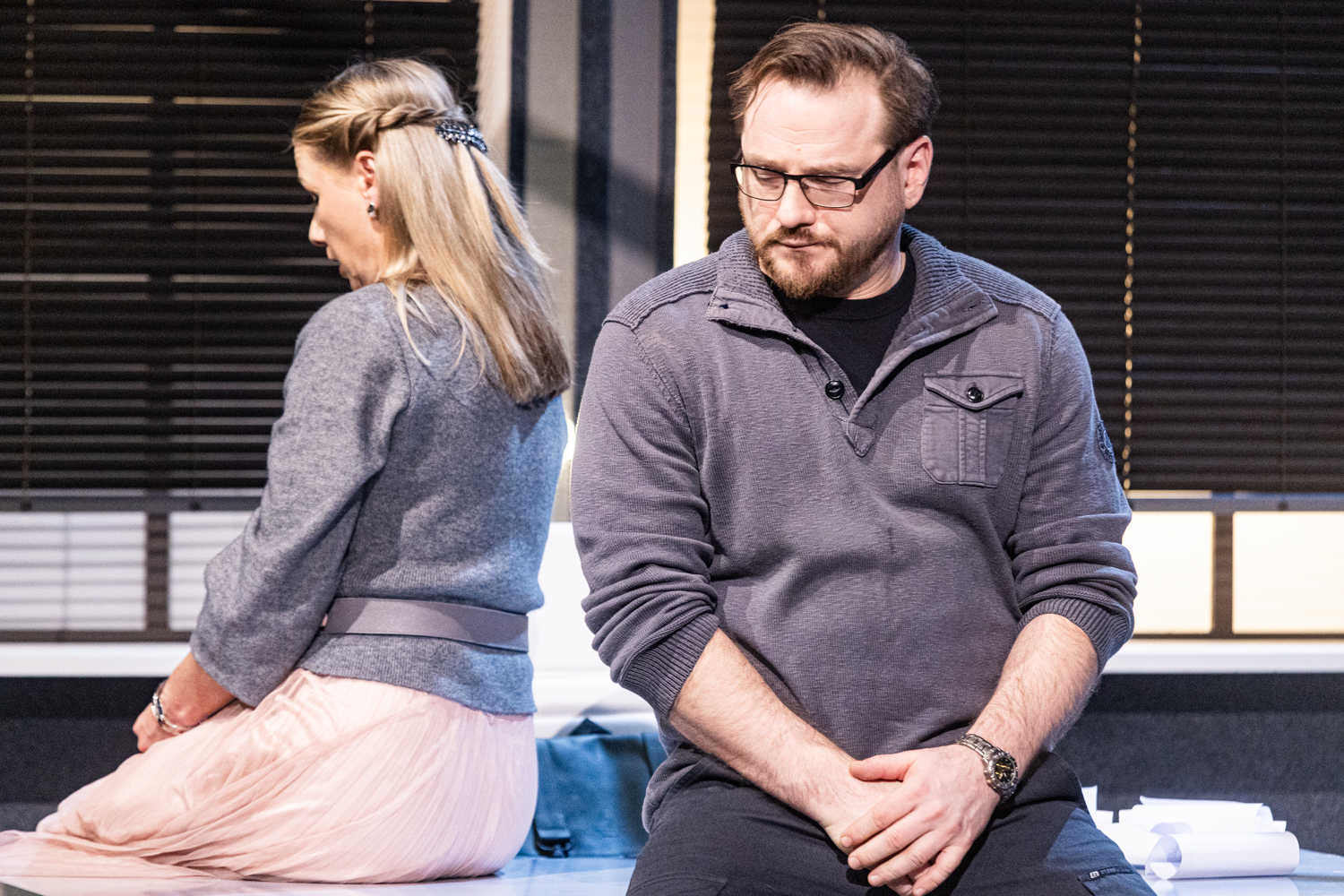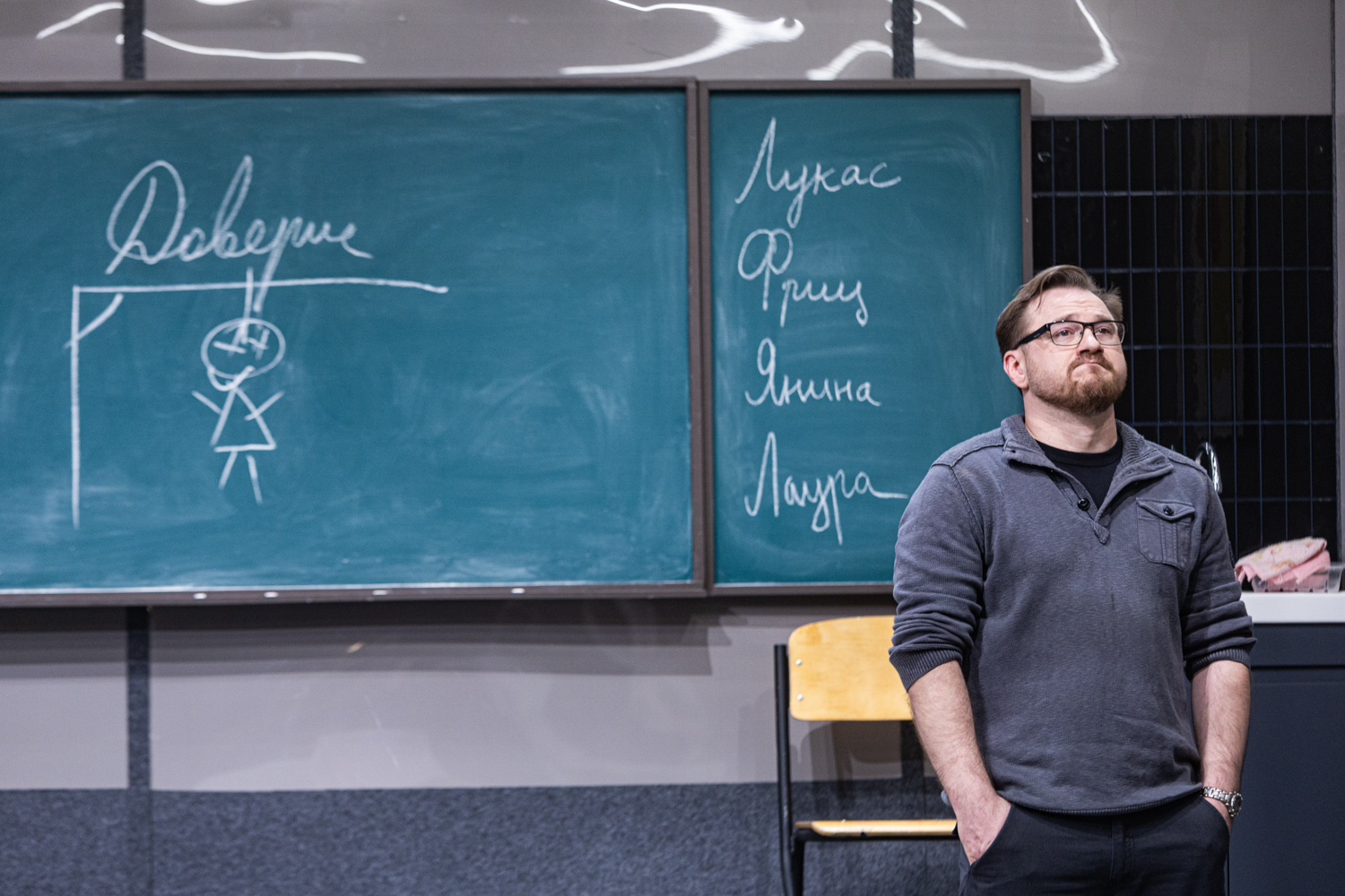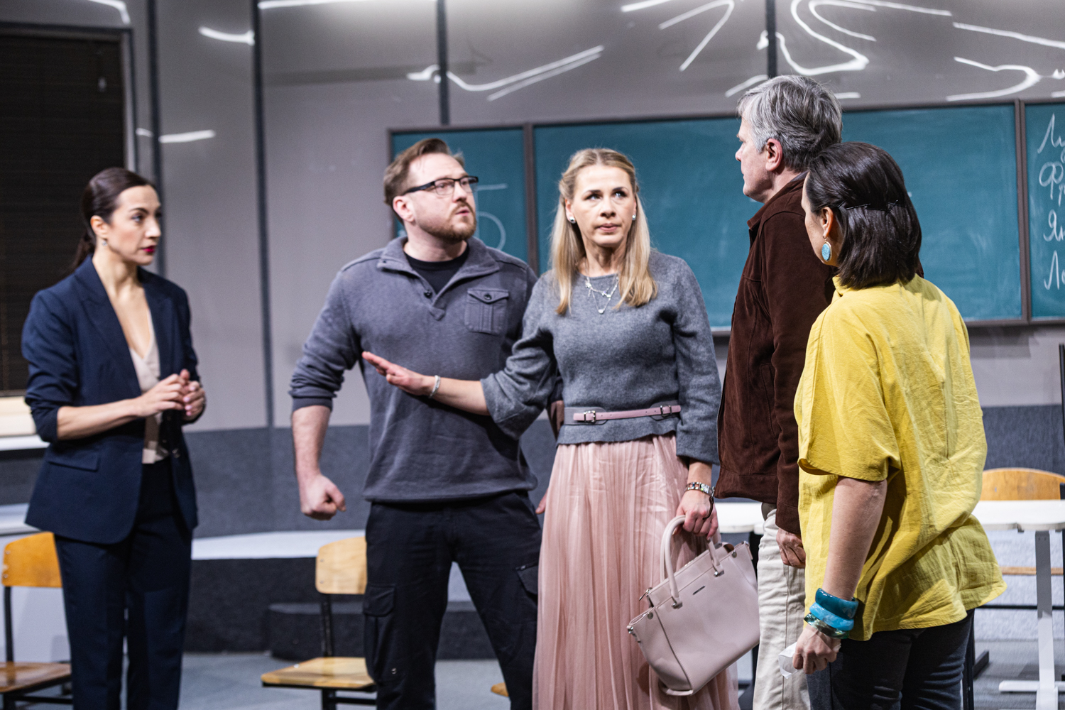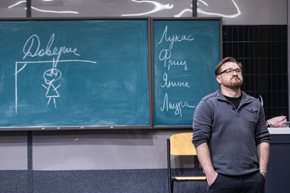 Omapärane on näidendi ülesehituses ka see, et õpetaja Sabine Müller, kelle ümber kogu intriig ja triangel käib, peaks justkui olema peategelane – aga kas ikka on? Päris kaua aega ei ole teda laval, sellal lapsevanemad möllavad omapäi, klatšivad ja klaarivad arveid. Seda loetavam, konkreetsem peaks olema Sabine Mülleri siseilm. Kui autorid on õpetaja Mülleri kirjutanud keskealiseks kogenud pedagoogiks (VAT-teatris mängis seda rolli Elina Reinold), siis Toikka on valinud noore osatäitja Darja Gavriltšenko. See muudab tahes-tahtmata tegelastevahelisi jõujooni ja konflikti varjundeid. Õpetaja noorus lisab nii isemeelsust kui ka haavatavust. Kui nii noore inimese missioonitundlikkus ja kutsumusetruudus põrkub lapsevanemate künismi vastu, on see ühtaegu sarkastiline ja valus. Darja Gavriltšenko avaldas sügavat muljet Miranda kirglikus ja dramaatilises rollis lavastuses „Kollektsionäär“ (John Fowlesi romaani põhjal, lavastaja Artjom Garejev, loomeruum PUNKT, 2025). Sabine Müller on teistmoodi, pigem sissepoole elav tegelane, just tänu sellele näitlejale nõudlik ülesanne. Ennekõike Gavriltšenko osalahenduse arengut olekski põnev veel kord vaadata.