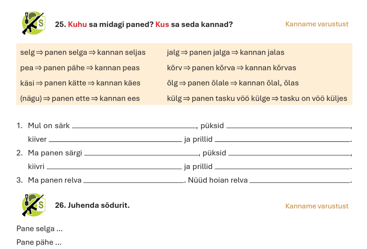 Kirjalikud ülesanded vahelduvad lünkharjutustest, sõnade ja sõnavormide äratundmise ja rakendamise ülesannetest (nt „Kirjuta pildi alla õige sõna“, „Ühenda sõna ja selgitus“, „Kirjuta sõna õiges vormis“) seletuskirjade, taotluste ja loovkirjutisteni (nt „Mida teeb sõdur kaitseväes?“). Rohkesti kasutatakse foto- ja videopõhiseid ülesandeid (nt „Mis varustust kannab sõdur pildil?“), samuti joonistusülesandeid (nt „Joonista kaitseväelinnaku kaart“). Rohkesti on ka autentsel ainesel ja argikeelel põhinevaid kuulamisharjutusi (nt „Kirjuta, mis juhtus“, „Kirjuta kõik auastmed, mida kuuled“).