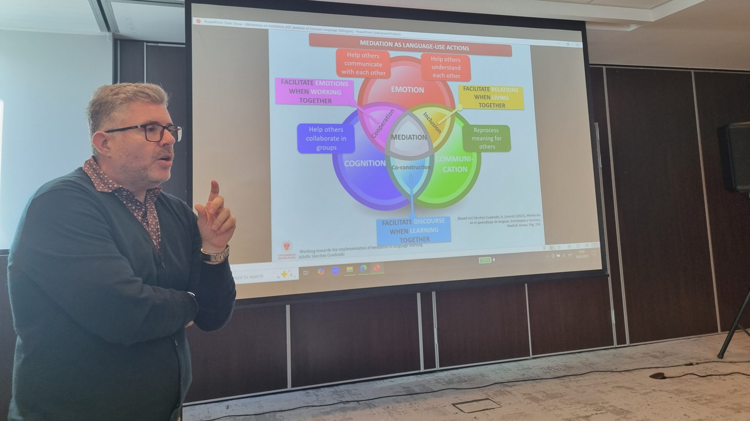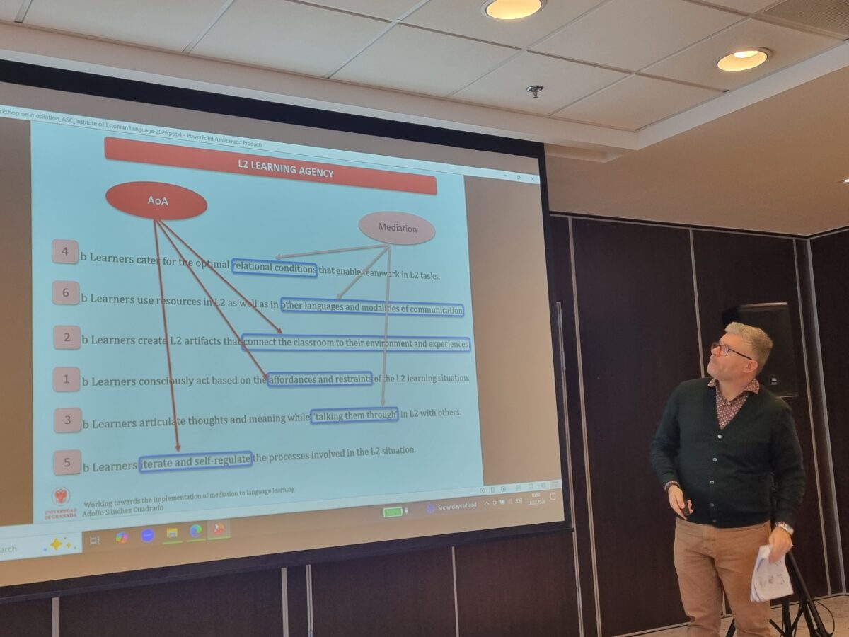 Pärast kuid tihedaid läbirääkimisi, veebikohtumisi ja kokkulepete sõlmimisi, toimus 19. ja 20. veebruaril Tallinnas võõrkeele ja eesti keele kui teise keele õpetajatele, keeleekspertidele, haridusjuhtidele ja koolitajatele professor Adolfo Sánchez Cuadrado tegevuspõhisele lähenemisviisile (ingl action-oriented approach) ja vahendamisele (ingl mediation) keskendunud töötuba „Working towards the Implementation of Mediation to Language Learning“.