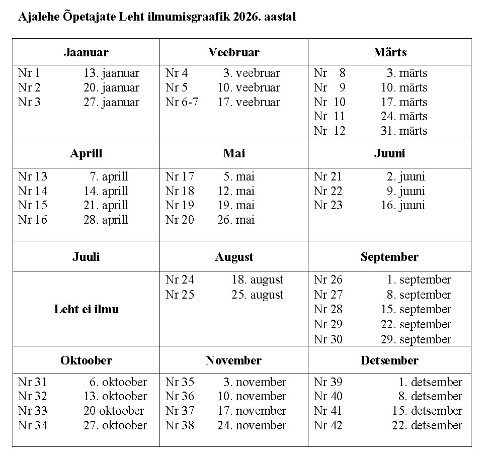 Aastas ilmub 42 numbrit. Õpetajate Leht ei ilmu 18.6–18.8, 24.12–31.12.